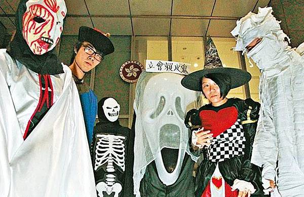 ■港視員工昨晚「化」成厲鬼,準備今日狙擊反對用特權法查發牌的議員。朱永倫攝