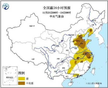 北京時間11月23日6時 中央氣象台繼續發佈霾黃色預警,華北中南部、黃淮、江淮、江南北部等地空氣污染達4級,局地達5級,不利於空氣中污染物擴散。河北中南部、京津地區、山西東部、山東中西部、安徽東部、江蘇南部、浙江北部、湖北南部、湖南北部等地有中度霾,局地重度霾。(網絡圖片)