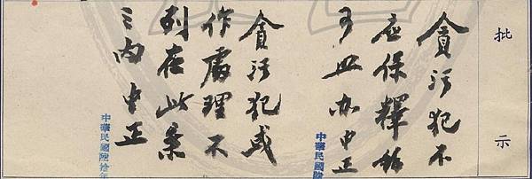 一份是1971年8月6日,因為監獄滿為患,適逢建國60週年,下屬建議保釋部分囚犯。總裁指示,關於貪污犯不可保釋,可見總裁對於道德與廉潔方面的堅持。(中國國民黨黨史館)