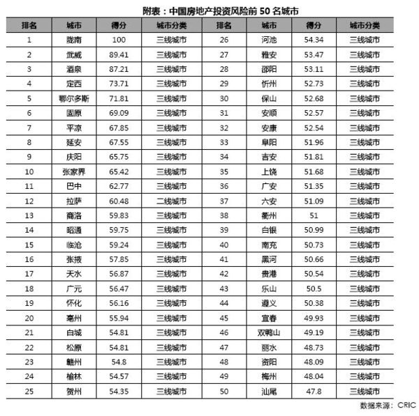 克而瑞信息集團研究中心發佈的《中國城市住宅發展前景與風險排行榜》顯示,三線城市的樓市風險遠高於一二線城市。在排行榜中,隴南、武威、酒泉、定西、鄂爾多斯、固原、平涼、延安、慶陽、張家界位列城市房地產發展風險前十位。其中風險最高的50個城市中,有49個在三線城市。