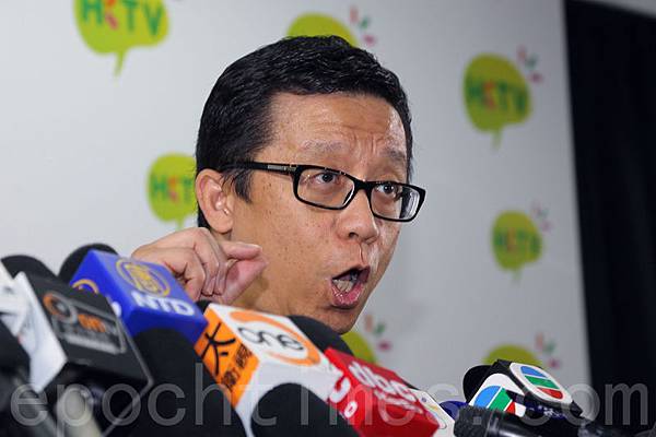 香港免費電視牌照風波至今月余;斥資數億一直被看好的香港電視網絡竟然不獲發牌,政府遲遲不交代真相,引起民怨沸騰,主席王維基批評梁振英當局黑箱作業,認為今次的結果是港人輸了免費電視選擇權和公義。(潘在殊/大紀元)