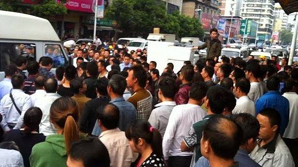 10月29日晚,江蘇無錫市長安鎮,十幾個城管暴力執法毆打兩名老攤販。路人看不過眼紛紛譴責城管,近千人包圍城管,城管被嚇得連忙登上車逃走。(網絡圖片)