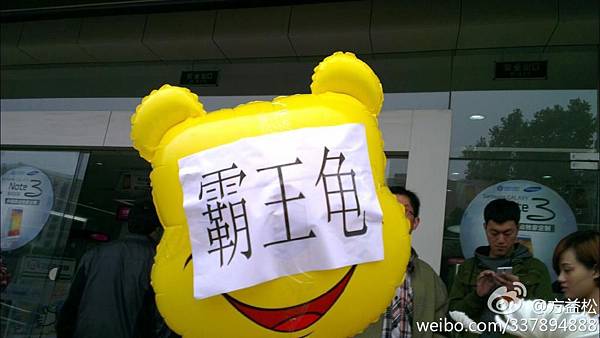 2013年10月26日,在南京珠江路移動未來城門外,幾十名移動用戶當街辦起了海報展,遛起了烏龜,集體獻上菊花,默哀祭奠等多種方式諷刺江蘇移動針對20元封頂套餐的毀約行為。(網絡圖片)