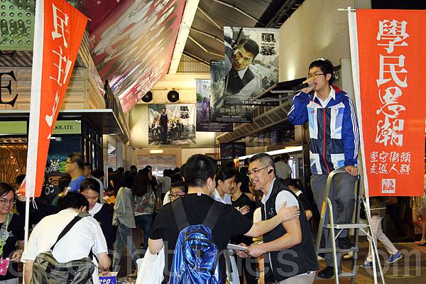 學民思潮星期二在香港旺角街頭發起簽名運動,呼籲更多市民參加次日星期三的集會,迫使建制派議員投票支持特權法調查電視拍照風波。(潘在殊/大紀元)