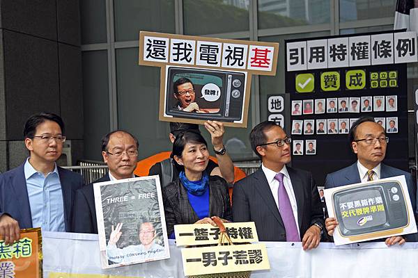 十多名泛民主派議員星期二下午到政府總部聲援香港電視視員工,呼籲更多市民參加次日星期三的集會,迫使建制派議員投票支持特權法調查電視拍照風波。(潘在殊/大紀元)