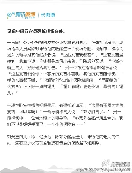 騰訊微博財經媒體人楊海鵬的一條長微博披露了這則重磅消息,稱上海一個私人博物館強拆現場,官員就地分贓錄像網上曝光,價值2.6億財產全被一搶而光。(網絡圖片)