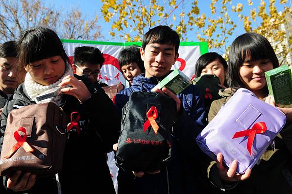 A group of Chinese college students show off their World AIDS Day "Red Ribbon" health packs which include packets of condoms, during a campaign in Liaocheng, Shandong province on December 1, 2013. UNAIDS estimates that there are 780,000 people living with HIV in China. CHINA OUT AFP PHOTO (Photo credit should read STR/AFP/Getty Images)