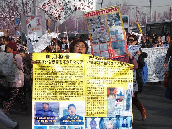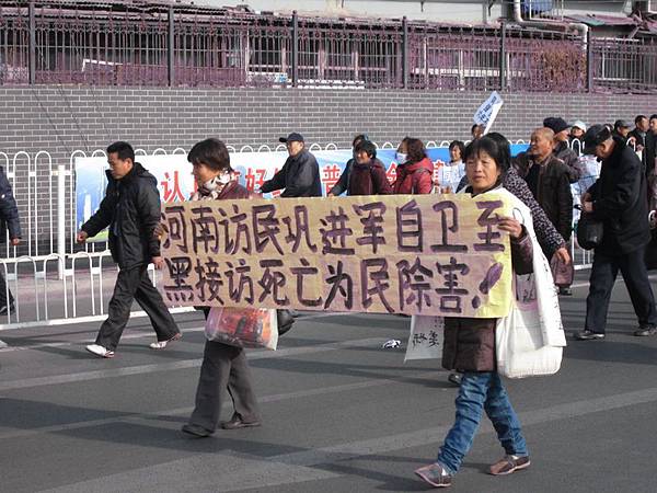 大約到早上10:40分左右,在京訪民集體走上街頭,從大平台開始往南站方向遊行示威,他們打出:「河南訪民鞏進軍自衛至黑接訪死亡為民除害!」「我要人權 還我丈夫」、「打倒造假法官」等等標語。