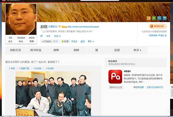 北京知名教授趙曉在微博上發出一張圖文並茂的博文,圖片上周永康正在打電話,身邊周圍坐著、後面站著一批陪同官員,配有文字:「據說這張照片上的高官,除了一位以外,都被抓了?」