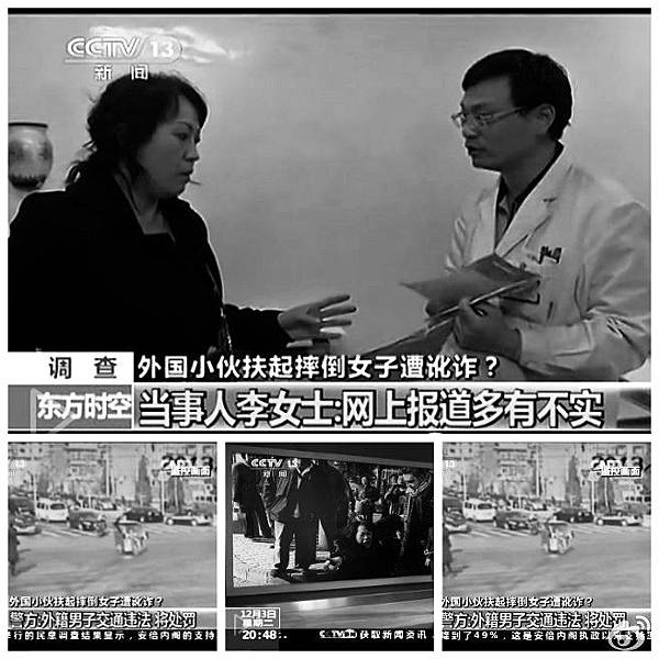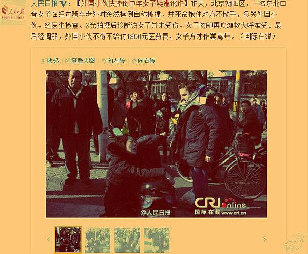 不久,中共央級媒體《人民日報》的官方微博以「外國小伙扶摔倒中年女子疑遭訛詐」為題發佈消息稱,「昨天,北京朝陽區,一名東北口音女子在經過騎車老外時突然摔倒自稱被撞,並死命抱住對方不撒手,急哭外國小伙」。