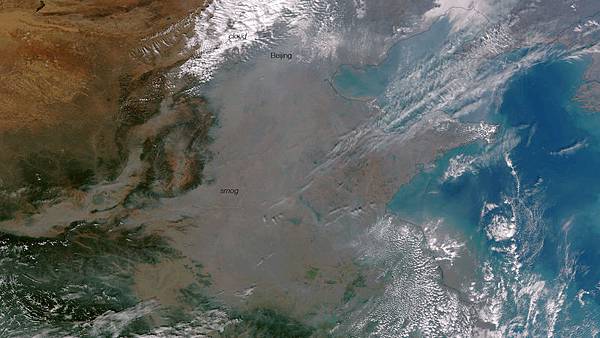 美國航天局1月14日拍攝的中國北方上空的陰霾。(美國航天局)