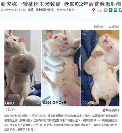 200 隻白鼠食用美轉基因玉米後普遍患癌。法國科學家經過對小白鼠長達兩年的實驗,做實驗的這批小白鼠普遍患上乳腺癌,並出現肝臟衰竭現象。 50%的雄鼠和 70%的雌鼠提前死亡。食物主要是孟山都公司推出的"nk603"轉基因玉米。公佈的照片顯示出它們身上長著巨大腫瘤。