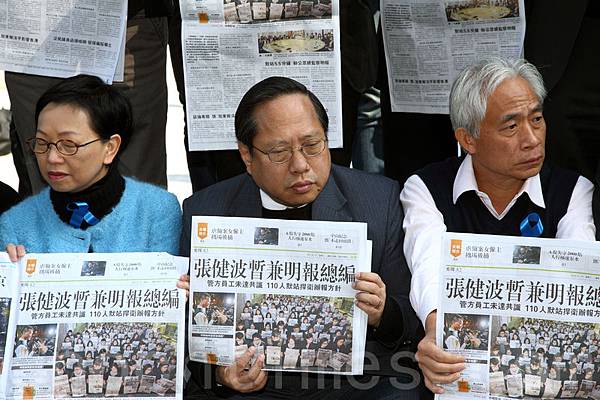 香港立法局泛民主派議員和明報員工一起呼籲各界捍衛香港的新聞自由。(潘在殊/大紀元)