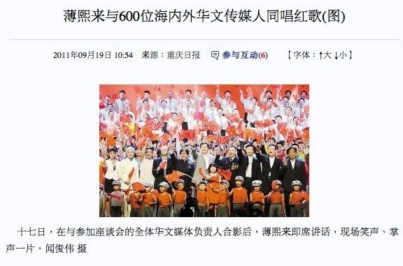 2011年9月,前重慶市委書記薄熙來拉來自全球50多個國家的600媒體老總高調唱紅歌。部分媒體老闆吹捧和討好薄熙來,包括加拿大臭名昭著的《華僑時報》社長周錦興、香港鳳凰衛視董事局主席兼行政總裁劉長樂還和薄熙來一起與演員同台唱紅歌。而明報老闆張曉卿也同台為薄站台。(網路截圖)