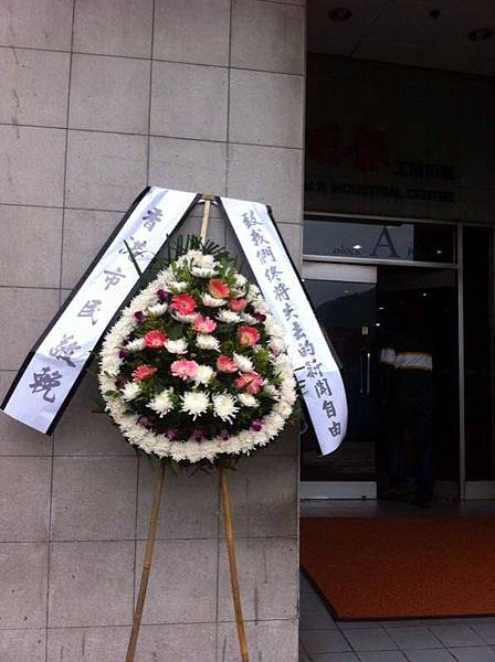 有市民早上在明報大樓外獻花圈,寫有「致我們終將失去的新聞自由」。(明報員工關注組FACEBOOK)