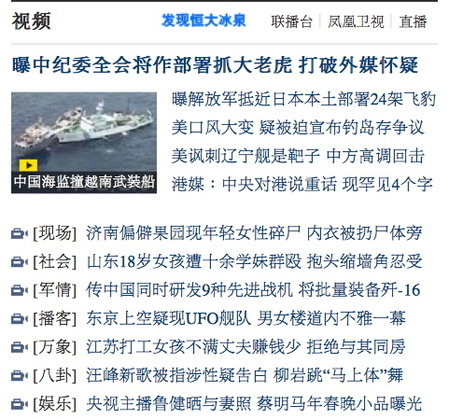 其次,香港「第二央視」鳳凰網自「周永康被抓」消息滿天飛之後,就不斷在首頁每天更新相關的評論報導,以「大老虎」等暗指利益集團的最高層。1月4日,鳳凰網首頁視頻報導的頭條以「曝中紀委全會將作部署抓大老虎打破外媒懷疑」作標題,向外釋放中紀委將於1月中下旬召開的十八屆三次全會將有大動作的信號。