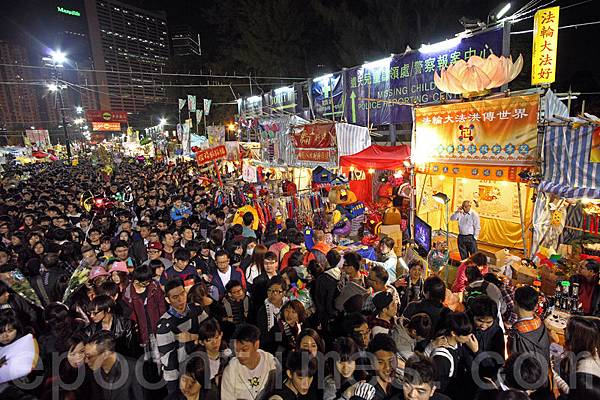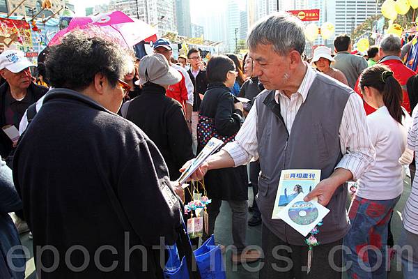 維園9號攤位,法輪功學員開設的年宵真相點,以「明真相、得福報」為主題,法輪功學員在現場派發真相特刊,還有真善忍蓮花、年曆等小禮品,大受市民歡迎,還有不少人主動上前索取真相畫刊。(潘在殊/大紀元)