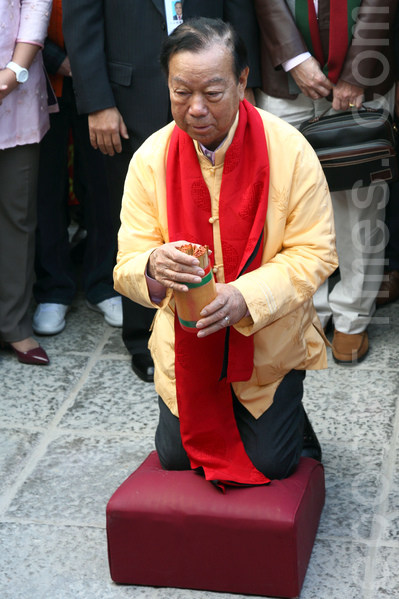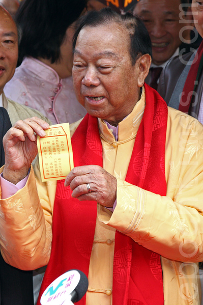 中國新年的大年初二是香港的車公誕,鄉議局主席劉皇發按傳統習慣,到沙田車公廟為香港上香祈福,求得一支中簽,籤文指積善天賜福,自然福長禍潛消。(潘在殊/大紀元)