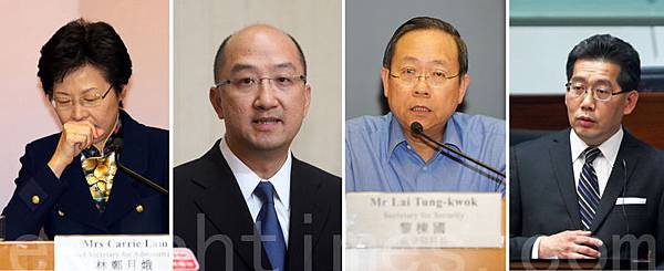 政務司司長林鄭月娥、政制及內地事務局局長譚志源、保安局局長黎棟國及商務及經濟發展局局長蘇錦樑,罕有同聲高調譴責網民的反自由行旅客行動,對愛字頭組織的暴力侵擾行為則從未提及。(大紀元合成圖片)
