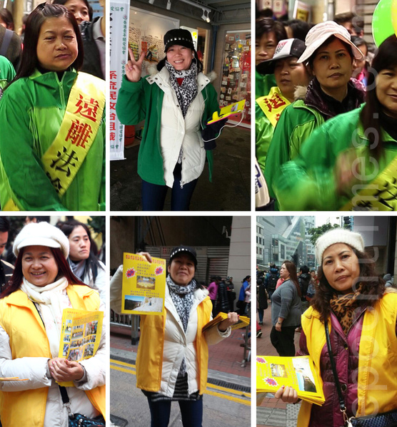 早前侵擾法輪功真相點的中共青關會人員,近日穿上黃色衣服,假扮成法輪功學員,到香港多個法輪功真相點搗亂。圖為其中三人,上排為偽裝前的青關會成員,下排為冒充法輪功學員的扮態。(大紀元)