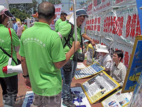 2月16日出現在《城市論壇》圍攻李慧玲的愛字頭成員(左),去年3月3日也曾經出現在香港銅鑼灣青關會侵擾法輪功真相點的現場。青關會副會長林國安(右一)、會長楊江(右二)一同被攝入鏡,垃圾歸邊就正是如此。(潘在殊/大紀元)