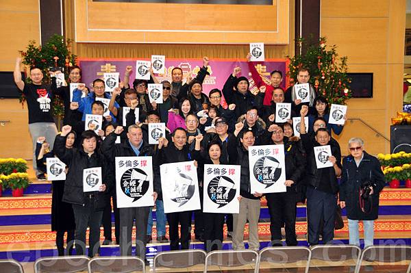 2月22日,在多倫多舉辦的港加聯記者會上,與會者佩戴藍絲帶,聲援香港「反滅聲」行動(周行。大紀元)