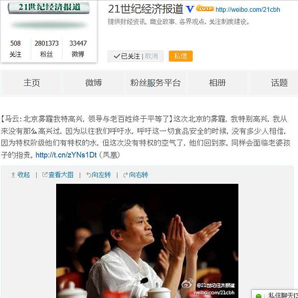 2月22日北京的企業家論壇(亞布力論壇)上,馬雲發表演講,談一個危機炮轟特權階級,稱「這次北京霧霾,我特別高興,我從來沒有那麼高興過,這次沒有特權的空氣了,他們回到家同樣會面臨老婆孩子的指責。」(網絡截圖)