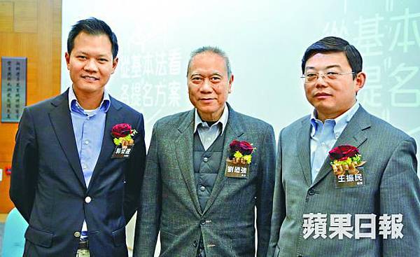 ●中共派學者來港推銷官旨:清華法學院長王振民(右),最近要求香港選舉保護精英的利益,不知所云。中為劉迺強,左為泛民學者。