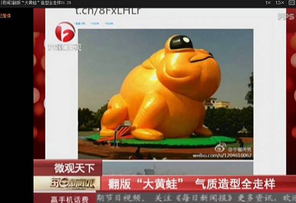 據大陸安徽衛視報導,近日,有網民曬出一組出現在廣東中山沙溪鎮的「大黃蛙」的圖片。據說跟大黃鴨同一個地方出廠,該地又出現一只超級「大蛤蟆」,大黃蛙的氣質造型全走樣。主持人稱:「這個造型,我就不點評論了。不能看,怎麼看都是呆懵呆懵的感覺。」