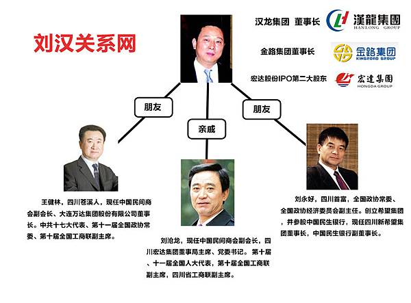 據東方日報,劉漢的關係網隨著經濟實力的擴張而水漲船高,從最先起家的廣漢、德陽,輻射到綿陽、成都,乃至北京。尤其是有了省政協常委的身份後,結交的官員級別已非普通富豪所能比。為拉攏腐蝕官員,劉漢不惜重金鋪路,贈送黃金、翡翠等貴重物品,價值幾十萬甚至幾百萬元。由於得到高官的鼎 力支持,劉漢已儼如「地下組織部長」,可以左右官員的烏紗帽。