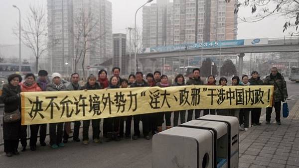 今年中共「兩會」前夕,大陸民眾在北京抗議「外國籍的『人大、政協』代表干涉中國內政。」(權利運動)