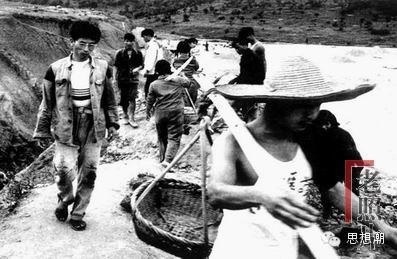 1960年湖南某築路工地,而照片中低著頭、徒手走來的一位戴眼鏡的男青年。(網絡圖片)