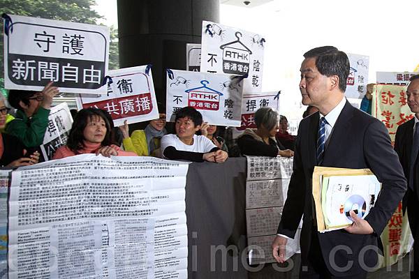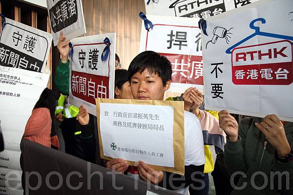 十多名香港電台節目製作人員工會成員到特首辦,抗議梁振英陰乾港台,強調要捍衛新聞自由。(潘在殊/大紀元)