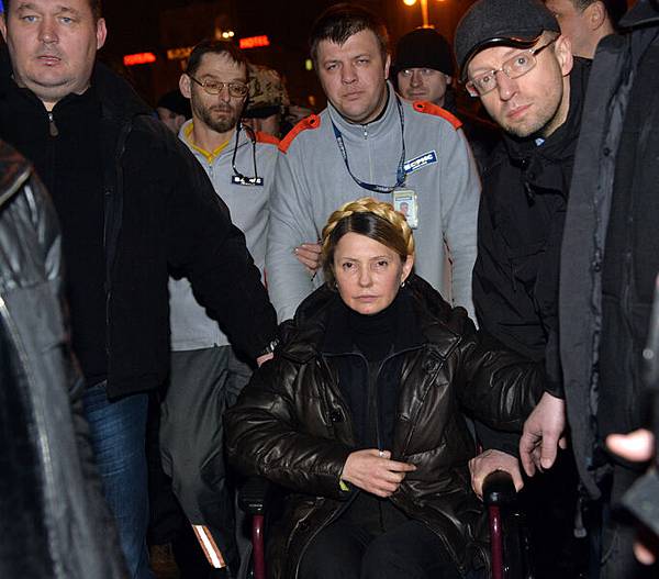 22日20點40分,剛剛被釋放的烏克蘭反對派領袖季莫申科抵達首都基輔的獨立廣場。廣場上數萬人歡呼雀躍。(AFP)
