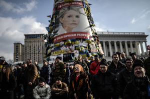 週六晚間,烏克蘭前總理、反對派領導人季莫申科被當局從監獄釋放。圖為21日基輔獨立廣場反對派人士製作的大型季莫申科展板。(AFP)