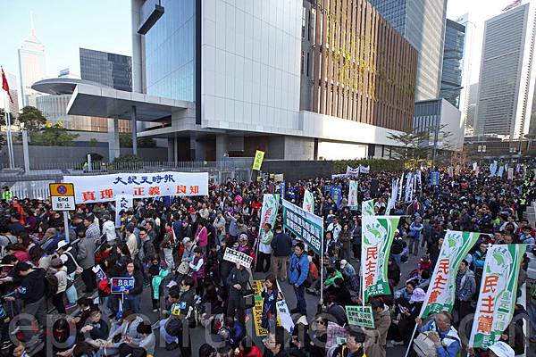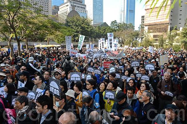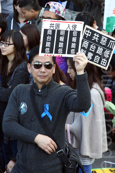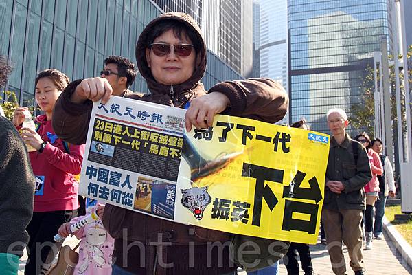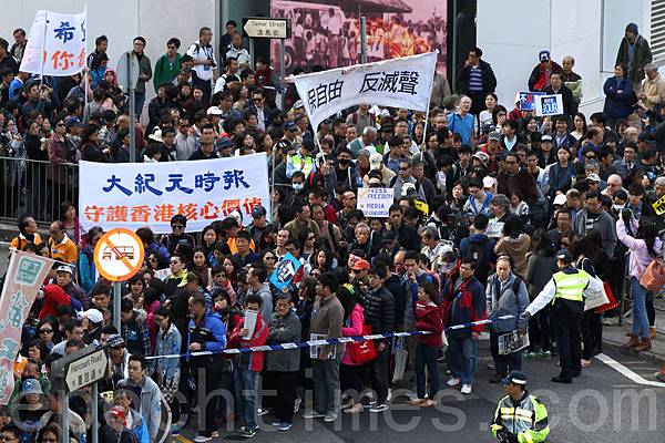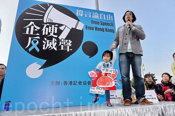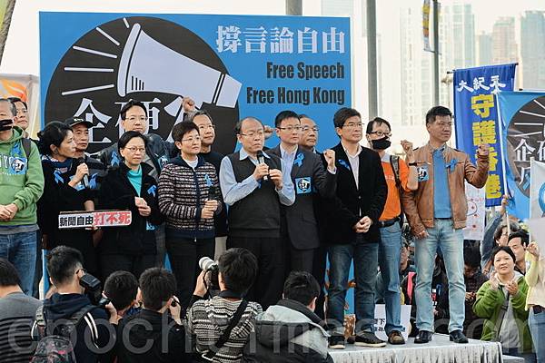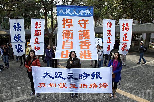 香港記者協會2月23日發起「反滅聲」大遊行和集會,記協宣布有超過6000人參加(最後更正10000人),其中大紀元時報的遊行隊伍最受矚目,深受市民歡迎,香港大紀元發言人指大紀元是最受中共打壓的傳媒,呼籲港人守護大紀元。(潘在殊/大紀元)