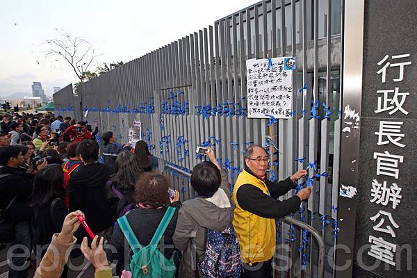 集會結束後,市民將代表言論自由藍絲帶綁在特首辦閘外,讓政府知道他們的訴求。