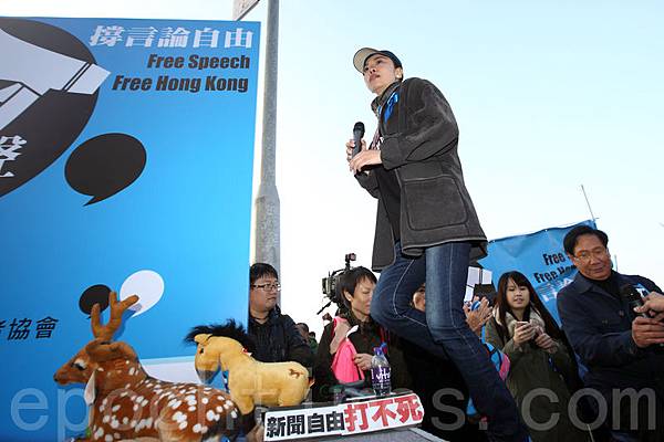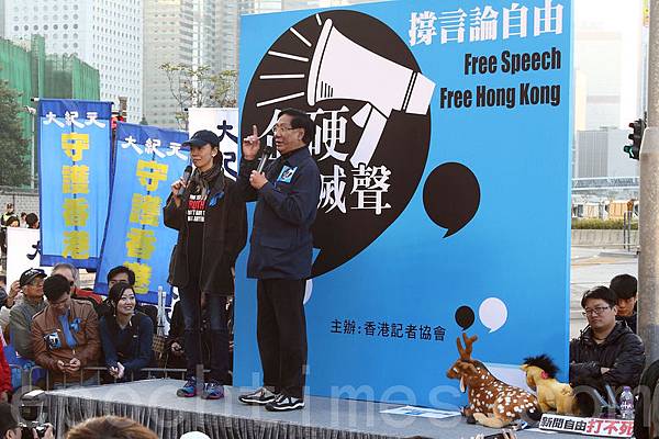 香港記者協會2月23日發起「反滅聲」大遊行和集會,記協宣布有超過6000人參加(最後更正10000人),創下記協舉辦遊行的人數紀錄,多位社會知名人士在集會中發言,批評中共打壓香港傳媒,圖為名嘴李慧玲和鄭經翰上台發言。(潘在殊/大紀元)