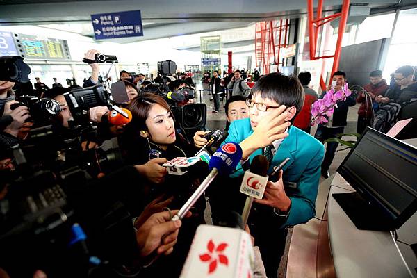 2014年3月8日,北京國際機場,馬來西亞航空公司負責人被記者攔住採訪。(大紀元資料室)