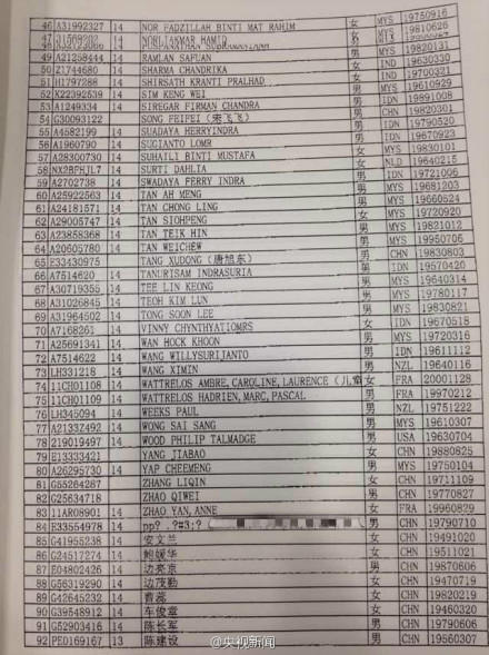 微博公佈的馬來西亞航空公司MH370次航班乘客名單。
