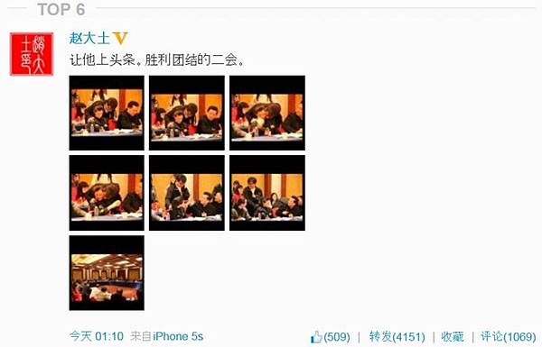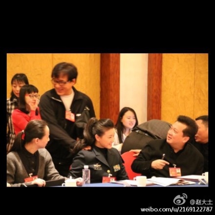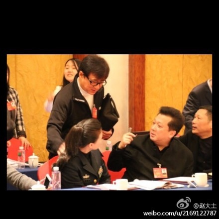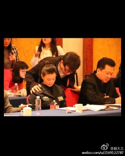 北京時間3月14日凌晨,有網民在微博上傳一組宋祖英與成龍在中共兩會上的曖昧照片。不到3小時,該組照片被轉發超4,000次,評論超1,000條,並登上24小時熱門微博排行榜,排第六。該組照片引發網民熱議、嘲諷。(網絡截圖)