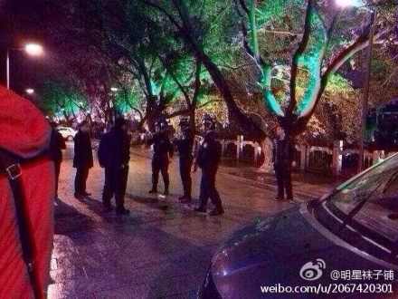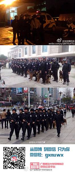 廣西師範大學的官方微博也證實:現在學校正門,側門等,只要有入口的地方,就有全副武裝的警察。請大家安心睡覺,一切照舊,明早正常學習、生活,其餘的請交給警察!