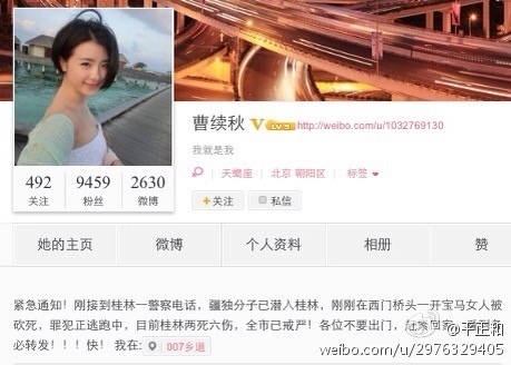 北京時間3月3日21:03,大陸女演員曹續秋在實名微博披露:剛剛發出緊急通知,稱疆獨分子潛入桂林,西門橋頭一開寶馬女人被砍死,罪犯正逃跑中,目前桂林兩死六傷,全市已戒嚴!如果此事屬實,警方應抓緊發佈官方消息並採取措施;如果不屬實,如此恐怖的信息發佈出來,後果……你懂的!