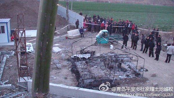 3月21日凌晨2點左右,山東平度市鳳台街道杜家疃村發生守地村民被澆汽油焚燒的慘劇,造成1死3傷,其中兩人重傷。當地村民表示,四名護地村民被堵在帳篷裡,帳篷四周被澆上汽油點燃。此事已引發當地上萬民眾的憤怒,一村民形容,「這裡就像炸藥廠,一點就著。」
