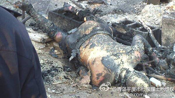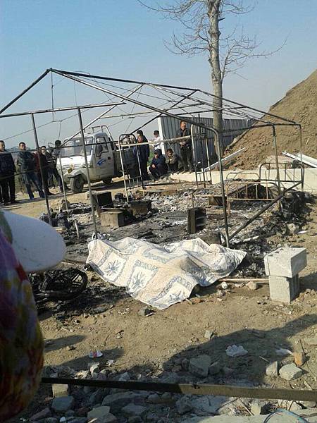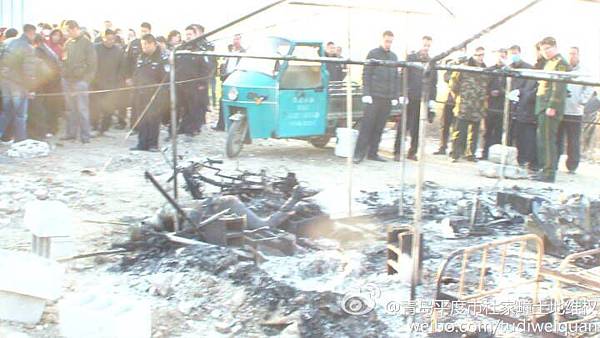 當地村民于先生告訴記者,「因為政府違法徵地,老百姓不同意,在工地上搭了一帳篷看地。昨天(21日)凌晨2點來了一夥人,把帳篷潑上汽油,然後燒起來,當場燒死一個。有兩個重傷在重症監護室,燒傷面積很嚴重,有人胳膊、腿都燒沒了,面目皆非。」