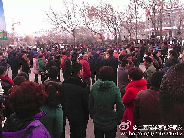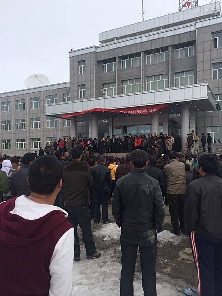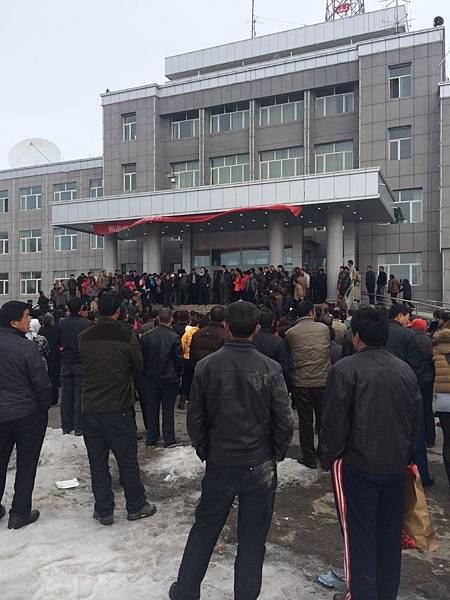 連續二天,新疆塔城市農九師164團上千職工圍堵團機關大樓抗議示威。(網絡圖片)