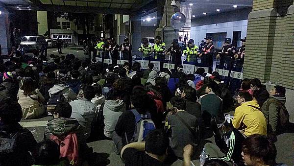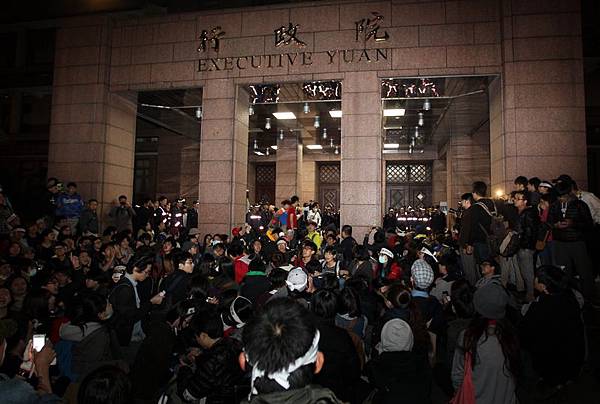 台馬反服貿民眾和學生23日闖入行政院,高喊「佔領行政院」,「退回服貿」;部分學生和民眾在行政院後門靜坐。(中央社)