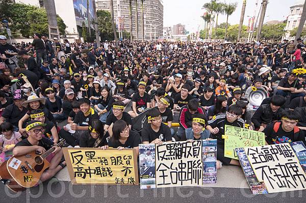 太陽花學運,3月30日黑衫軍上凱道反服貿,主張「捍衛民主、退回服貿」。(梁淑菁/大紀元)。