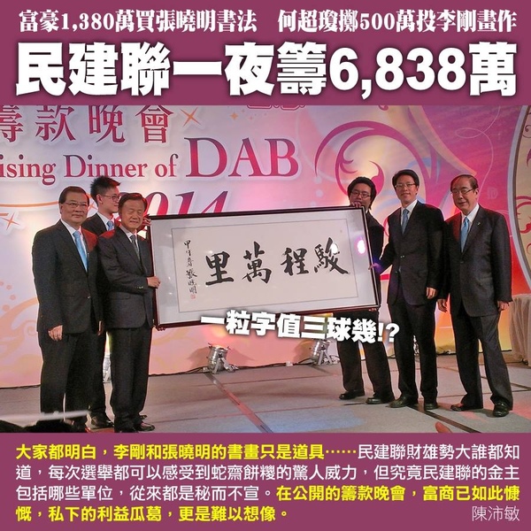 民建聯的2014年籌款晚會籌款再創記錄,將近七千萬港幣,張曉明一幅「駿程萬里」書法,獲上海世貿集團董事長許榮茂以1,380萬元天價投得,此舉遭民主黨元老李柱銘等人士斥責為典型的大陸「貪腐」行為。(網絡圖片)
