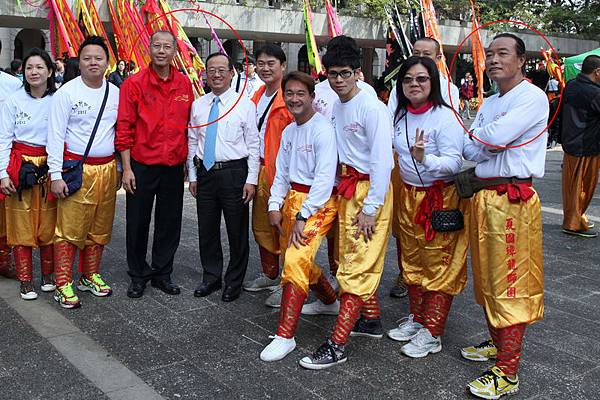 左邊紅圈內的分別為夏國章龍獅團掌舵人夏德建(左)和民建聯立法會議員陳鑑林(右) ,右邊紅圈的人為夏國璋龍獅團的成員,被發現參與青關會干擾法輪功的活動。(網絡圖片)